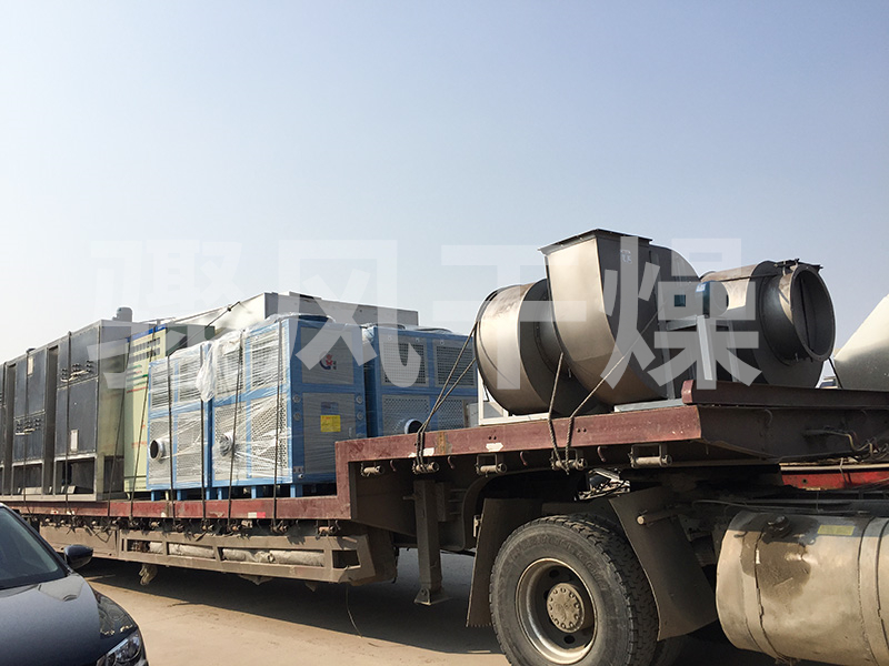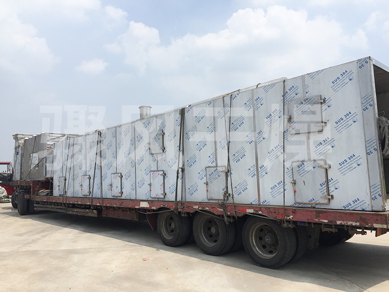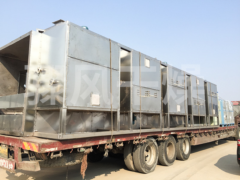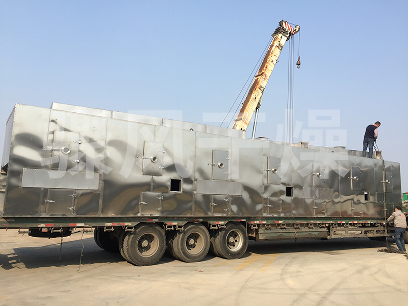 物料由加料器均匀地铺在网带上,网带一般采用12-60目不锈钢丝网,由传动装置拖动在干燥机内移动。干燥机由若干单元组成,每一单元热风独立循环,部分尾气由专门排湿风机排出,废气由调节阀控制,热气由下往上或由上往下穿过铺满物料的网带完成热量与质量传递的进程,带走物料水份。