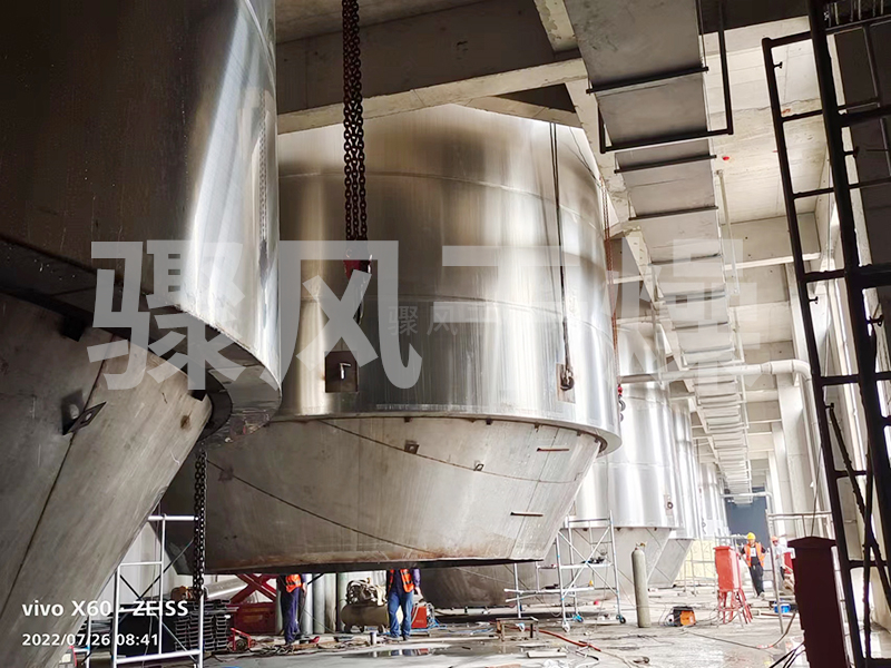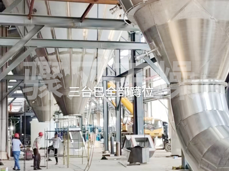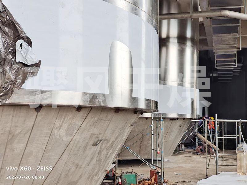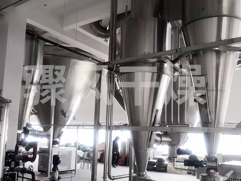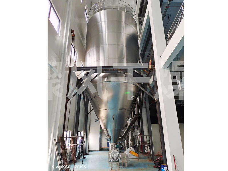 空气经过滤和加热,进入干燥器顶部空气分配器,热空气呈螺旋状均匀地进入干燥室。料液经塔体顶部的高速离心雾化器,(旋转)喷雾成极细微的雾状液珠,与热空气并流接触在极短的时间内可干燥为成品。成品连续地由干燥塔底部和旋风分离器中输出,废气由风机排空。