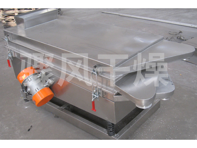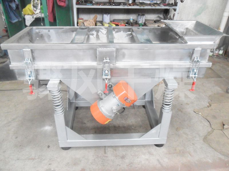 本机上部采用快拆式手柄,把整机连成一个整体,上盖采用全密封,防止物料在过筛时由于振动而产生粉尘飞扬。筛体下部安装振动电机,保障了设备的结构紧凑,下部采用弹簧减震,使整机在平稳状态下工作。下面底座采用可调式,可调整在过筛时的筛面倾斜角度,根据物料特性以取得较好过筛效果。