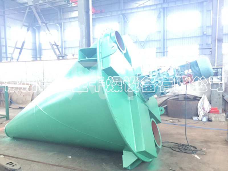 混合机由两非对称螺旋片快速自转,物料向上提升,形成两股非对称沿筒臂由下向上的螺旋物料流。转臂带动的螺旋公转,使螺旋外的物料不同程度进入螺柱包络线内。