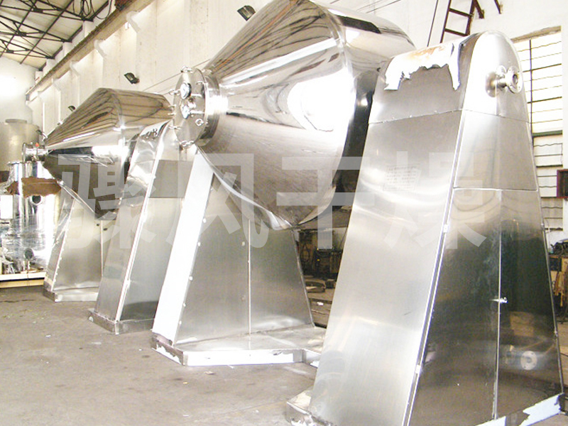 由电动机、减速机经齿轮传动带动混合罐体转动,工作时将配制好的各种粉料加入到混合机罐体内,通过罐体的回转,使物料靠其重力和离心力反复进行聚合和分离而达到混合均匀,混合好的物料靠自重由排料口卸出。